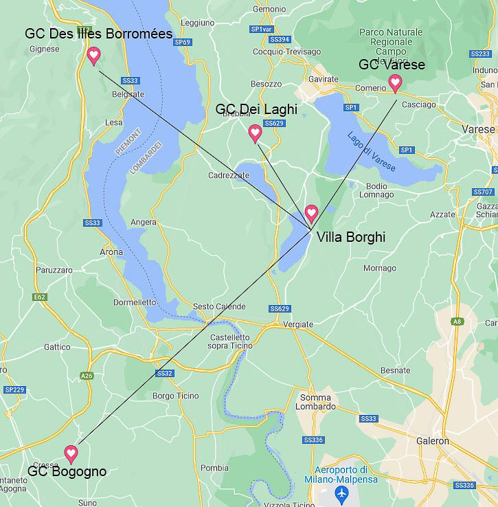 Hoch über dem Lago Maggiore und den borromäischen Inseln liegt der Golfplatz «Des Illes Borromées» komplett verborgen in den Wäldern. Der Platz ist recht hügelig und spieltechnisch anspruchsvoll. Der Pflegezustand ist ausgezeichnet. Die Wege zwischen den Spielbahnen sind teilweise sehr lang, deshalb hat Toni für uns alle Golfcarts reserviert. Gute Idee.