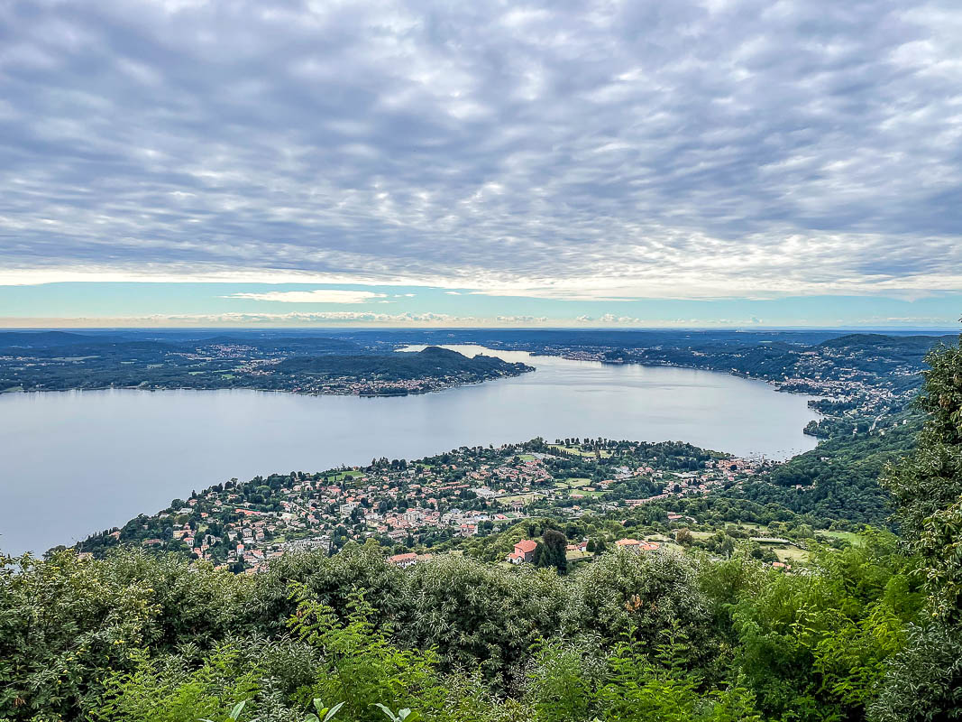 Die Aussicht auf den Lago Maggiore und den dahinterliegenden Lago di Varese ist spektakulär. Dank des Föhnwetters sehen wir in der Ferne auch die Skyline von Milano (ca. 70 km).