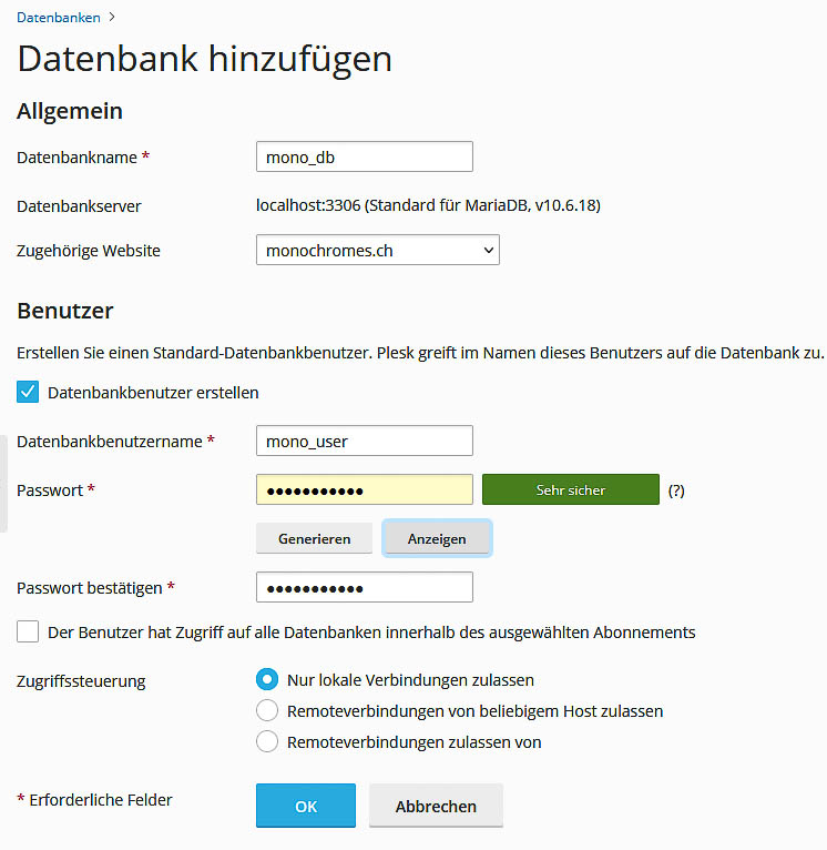 Diese drei Parameter werden später für die WordPress-Installation gebraucht. Wichtig zu wissen, dass DB-Benutzer und DB-Passwort nur zwischen WordPress und der Datenbank verwendet werden – nirgendwo sonst. Sie können also frei und unabhängig gewählt werden.