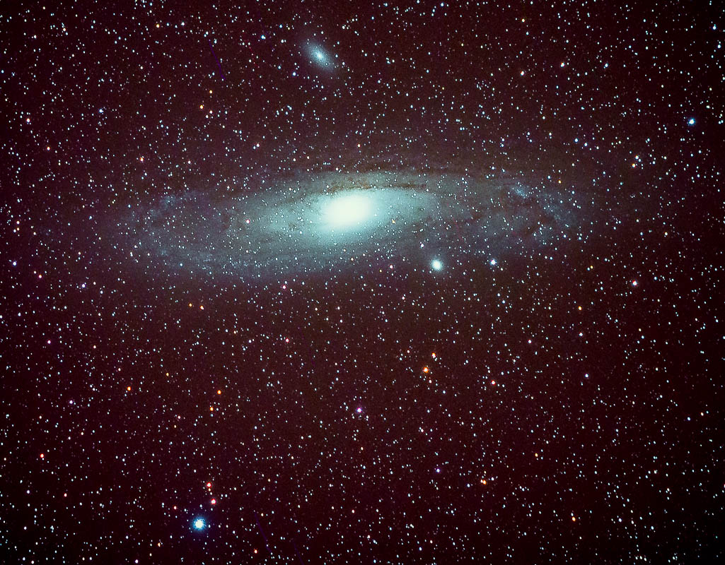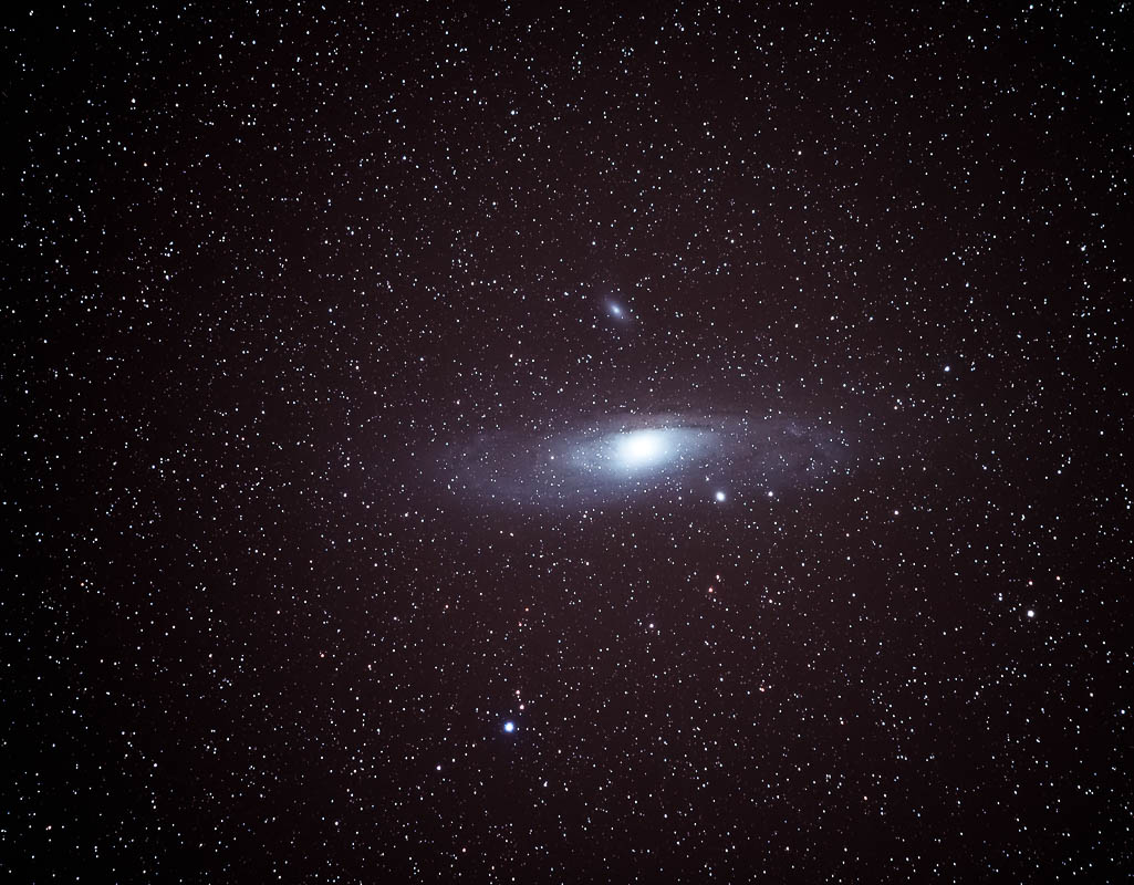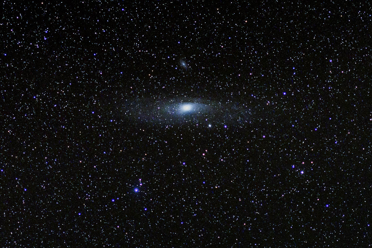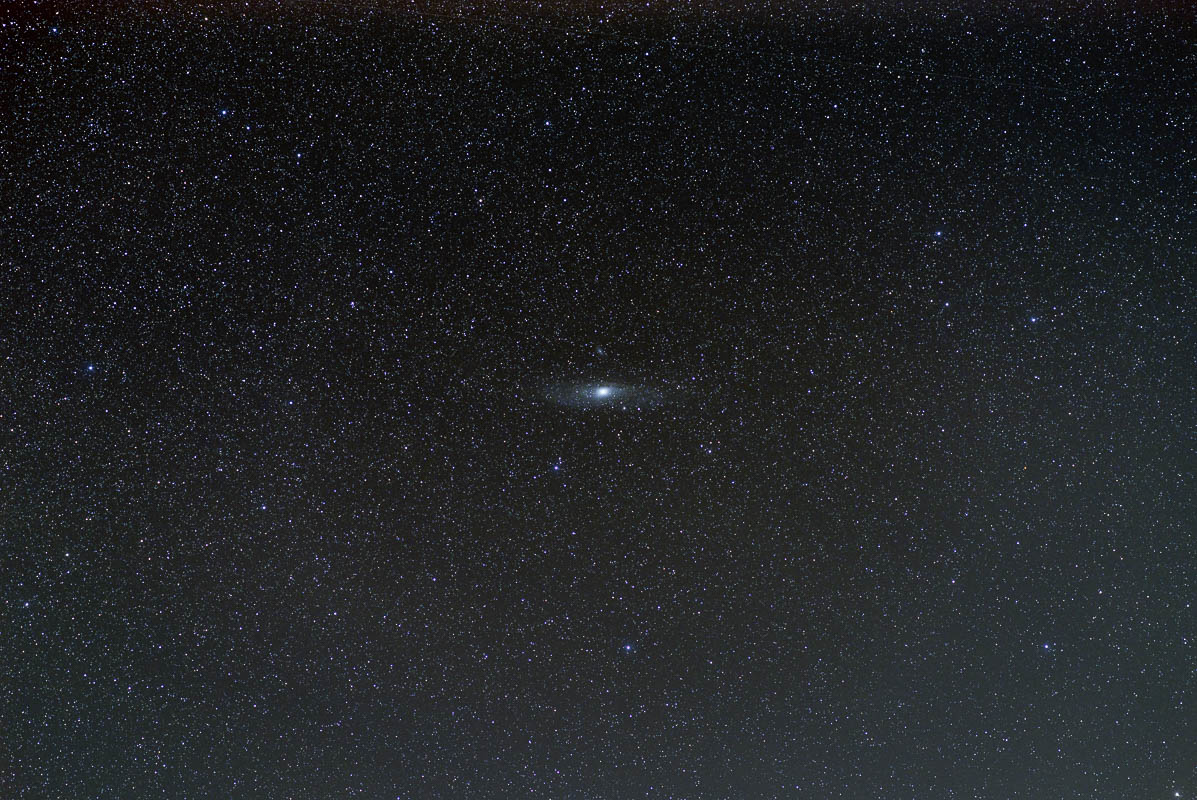 Meine ersten Versuche, die Andromeda-Galaxie zu fotografieren, unternahm ich vor meinem Haus in mässig dunkler Nacht mit hoher Lichtverschmutzung. Mein Ziel war eigentlich das Sternbild Kassiopeia, welches mit dem 105-mm-Objektiv ziemlich formatfüllend abgebildet wird.