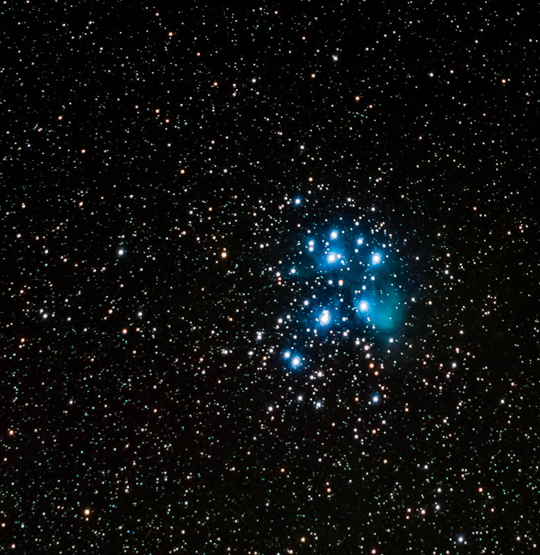 Weil die Nacht so schön und klar war, machte ich noch eine zweite Serie mit dem Teleobjektiv (300 mm DX) und zwar Richtung Plejaden im Südosten. Ich finde, auch diese Aufnahme ist gut gelungen, hervorragend sieht man den Reflexionsnebel um den Stern Merope (Meropenebel).