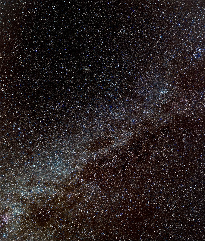 Ich richtete die Kamera mit dem Weitwinkelobjektiv ziemlich genau senkrecht nach oben und belichtete 45 mal 1 Minute. Das Resultat gefällt mir, sogar die Andromedagalaxie ist deutlich zu sehen.