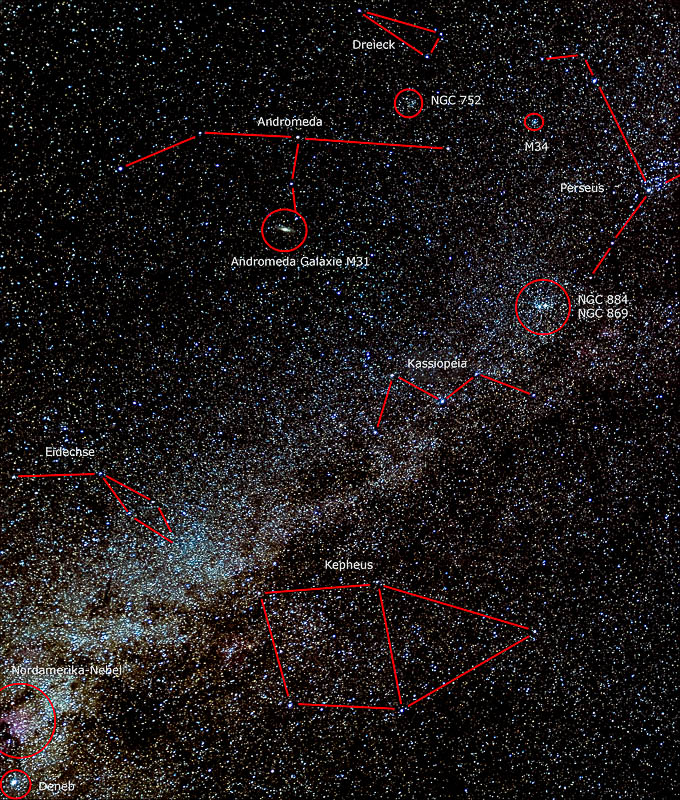 Das Erkennen einzelner Konstellationen ist in diesem «Chaos» recht schwierig. Deshalb habe ich mithilfe von Stellarium die wichtigsten Sternbilder und Sternhaufen bestimmt und eingezeichnet.