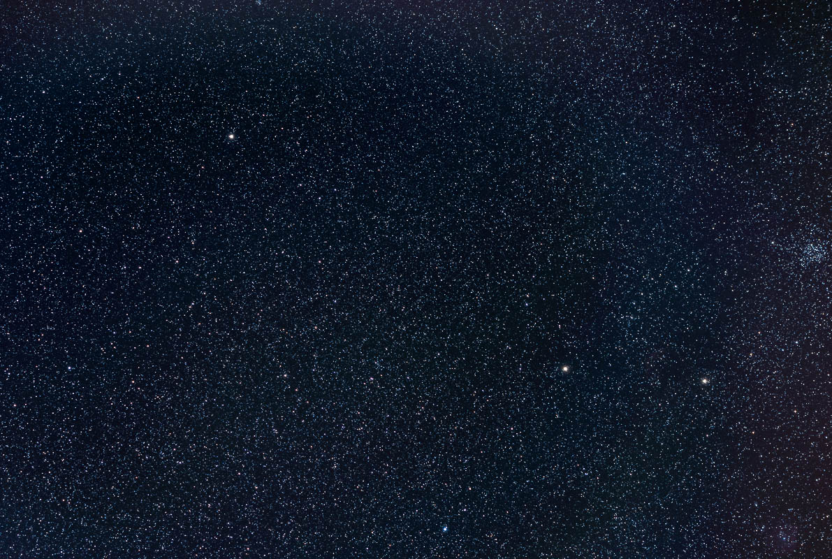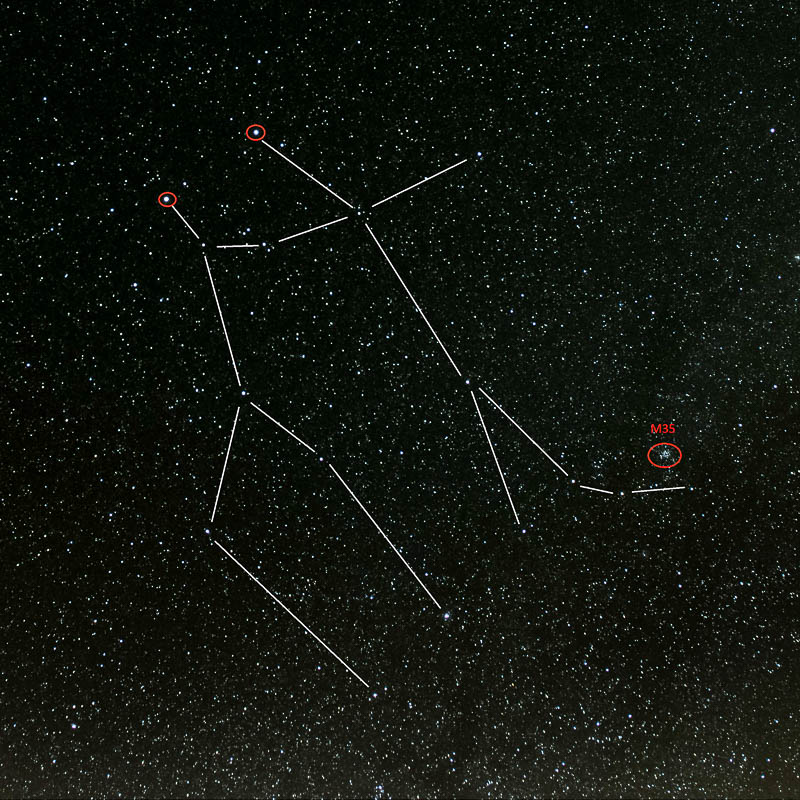 Bei Castors linkem Fuss findet man deutlich das Messier-Objekt M35. Ein offener Sternhaufen in ca. 2800 Lichtjahren Entfernung mit einem jugendlichen Alter von ca. 100 Mio. Jahren. Er ist bereits mit blossem Auge als nebliger Fleck erkennbar.
