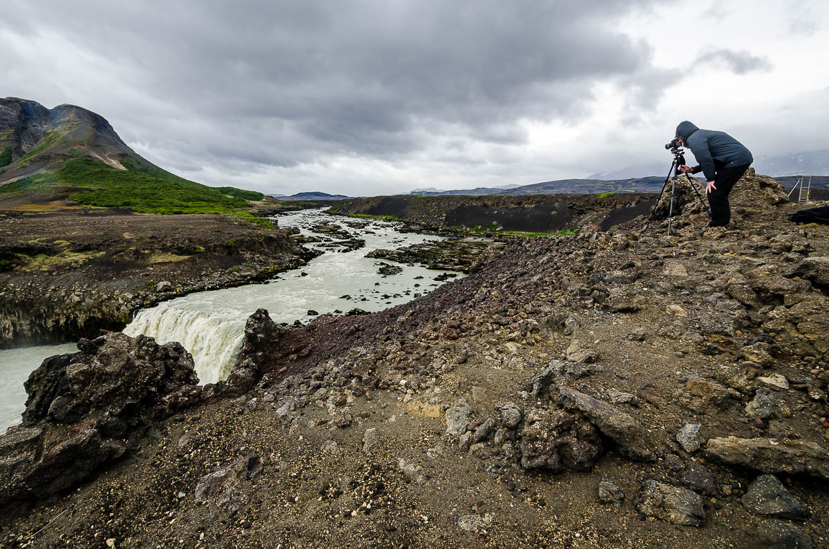 Über Nacht sind die Temperaturen merklich gefallen und ein steifer Wind bläst über das Hochland. Noch wärmere und winddichte Kleidung ist angesagt. Die Stative mit den schweren Kameras haben Mühe, um ruhig zustehen. Aber was soll’s – interessante Fotomotive gibt’s hier zuhauf. Berge, Flüsse, Wasserfälle oder riesige, mit weichem Moos überwachsene Lavafelder – Zeugen früherer Vulkanausbrüche.