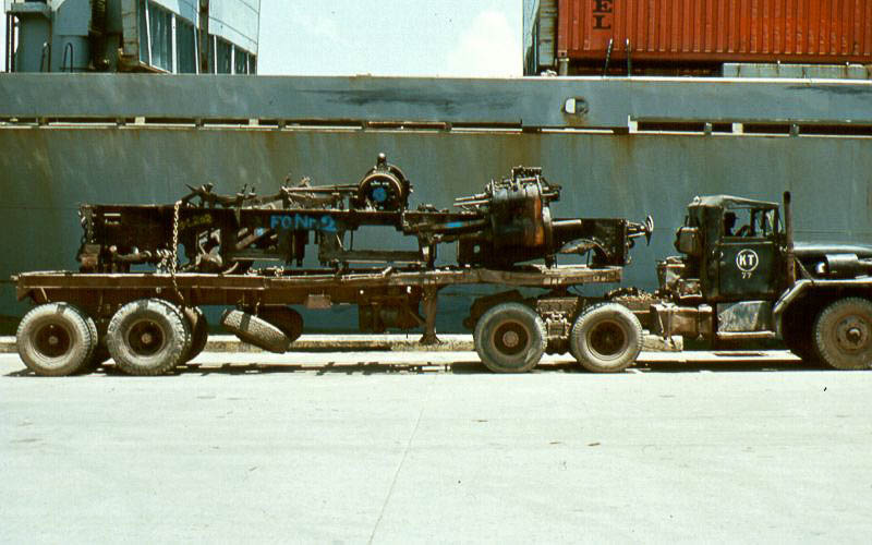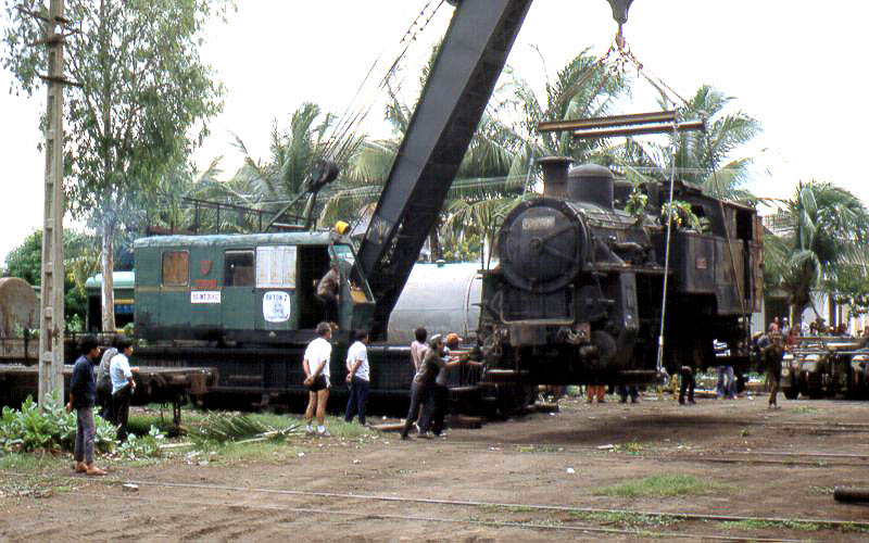 Nun musste das Material noch nach Thap Cham gebracht werden, von wo aus später alles zusammen möglichst auf eigenen Rädern über die Stammlinie nach Saigon gezogen werden sollte. Dabei erwies sich die Strassenbrücke Nr. 13 (man beachte!) definitiv als zu wenig tragfähig. In weiser Voraussicht hatten die engagierten Vietnamesen nochmals neue Gleise gelegt über die benachbarte, aber stillgelegte, 180 m lange Eisenbahnstahlbrücke und beidseitig Zufahrtsrampen erstellt, um die Loks vom Strassentieflader auf die Schienen und zurück bringen zu können.