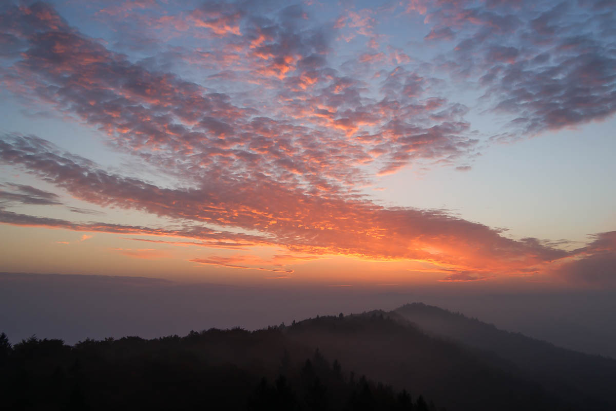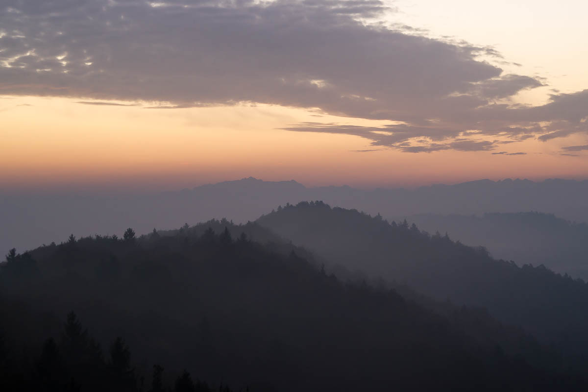 Das erste brauchbare Bild ist noch etwas flau in den Farben, aber die Silhouette des Alpsteins ist schon deutlich zu sehen. Genau dort muss in kurzer Zeit die Sonne erscheinen.