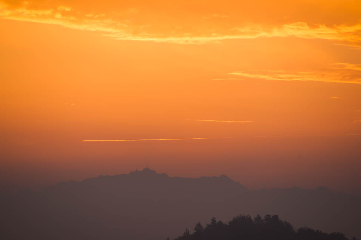 Unmittelbar vor Sonnenaufgang werden die Konturen der Alpsteinkette wieder deutlich sichtbar. Dieses Mal mit einem 300-mm-Teleobjektiv aufgenommen. Auf dem Säntis sieht man sogar den grossen Sendemast. Der Himmel ist vollständig ins orange Licht der aufgehenden Sonne getaucht.