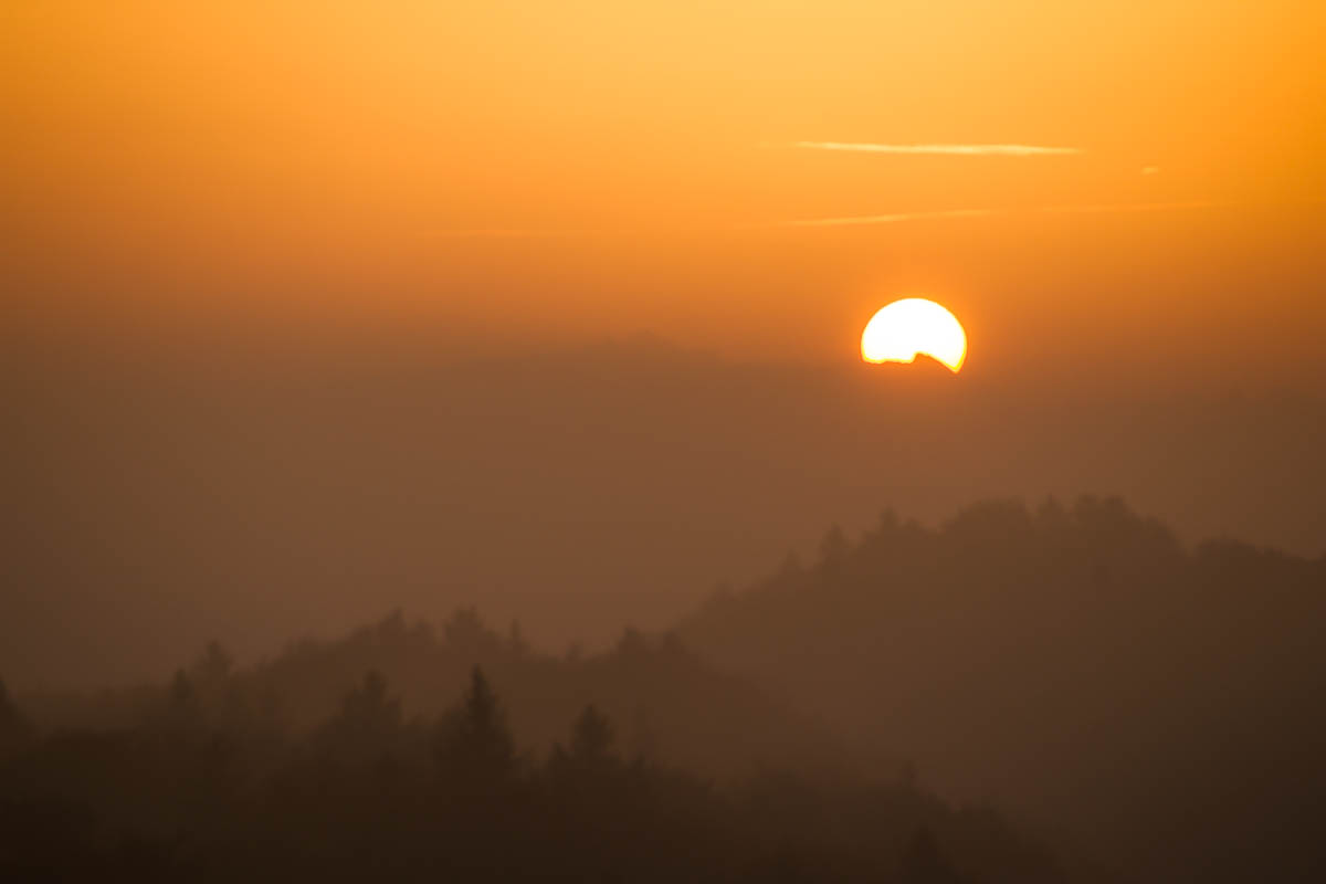 Nun ist es so weit. Die Sonne zeigt sich – wie vorhergesagt – über dem Alpstein, genauer: über dem Wildhauser-Schafberg. Noch kann man direkt in die Sonne fotografieren, ohne Überbelichtungen zu riskieren. Das wird aber in den nächsten Minuten vorbei sein.