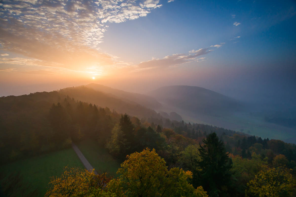 Ich habe herausgefunden, dass am 21. Oktober die Sonne ziemlich genau über dem Säntis aufgeht, wenn ich auf dem Aussichtsturm Altberg bei Dänikon stehe. Die genauen Daten: Blaue Stunde, Beginn: 7.22 Uhr; Sonnenaufgang: 7.55 Uhr. Ausserdem haben wir zurzeit relativ viel Nebel im Tal, welcher sich erst gegen Mittag auflöst. Diese Konstellation könnte einige interessante Aufnahmen ermöglichen.