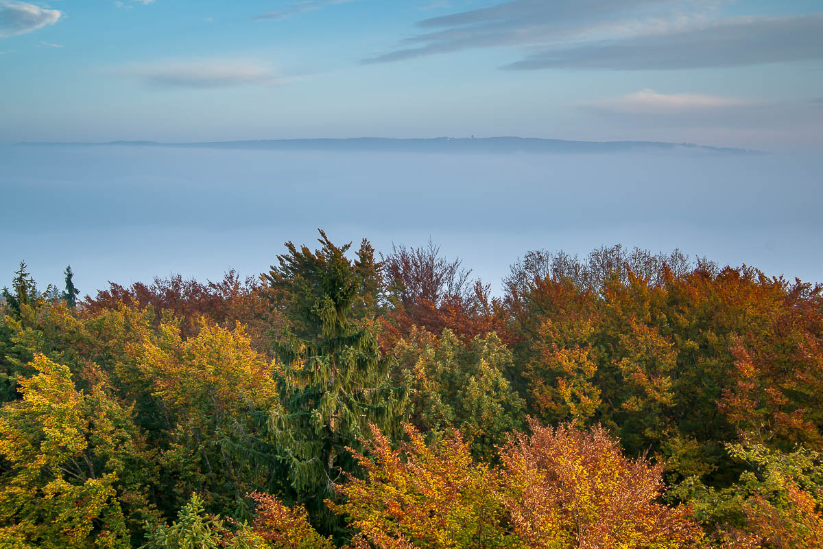 Das Furttal liegt noch unter dem dichten Nebel. Im Hintergrund im Norden der Hügelzug der Lägern mit dem grossen Flugsicherungs-Radar auf der Hochwacht. Im Vordergrund der prächtige Herbstwald des Altbergs unter mir. Ich stehe ja auf dem Aussichtsturm 33 m über dem Boden.