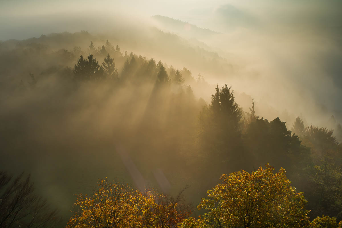 Es wird Tag. Langsam wird die ganze Gegend in das stärker werdende Tageslicht getaucht. Die bunten Herbstfarben der Laubbäume beginnen herrlich zu leuchten. Jetzt ist wieder ein starkes Weitwinkelobjektiv gefragt, um die Weite der Landschaft einzufangen.