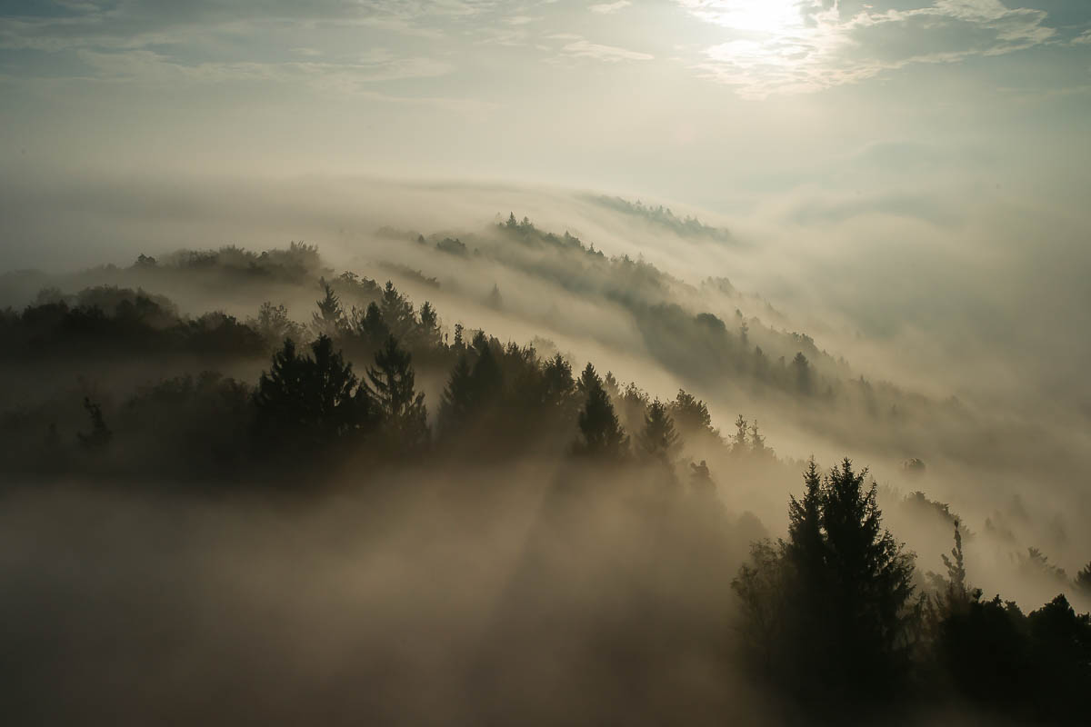 Ich wende mich aber wieder dem Gegenlicht zu. Zum Glück bin ich alleine auf dem Turm, da stört die laufende Umstellung des Stativs niemanden. Ich traue meinen Augen nicht. Der Nebel steigt langsam den Berg hinauf und verändert die Szenerie im Minutentakt. Es wirkt mystisch, aber begeisternd, wie der neue Tag allmählich die Macht übernimmt. Wie heisst es so schön in der Zauberflöte: «Die Strahlen der Sonne vertreiben die Nacht».