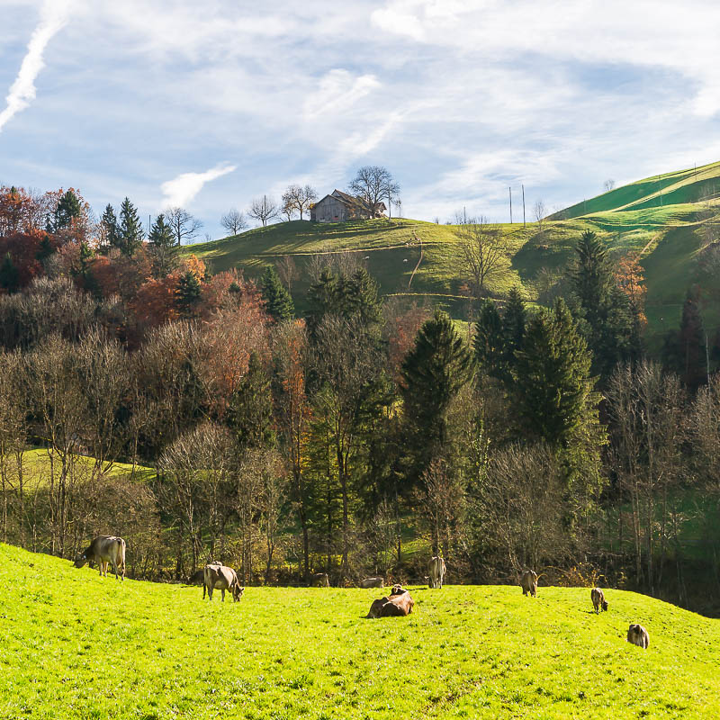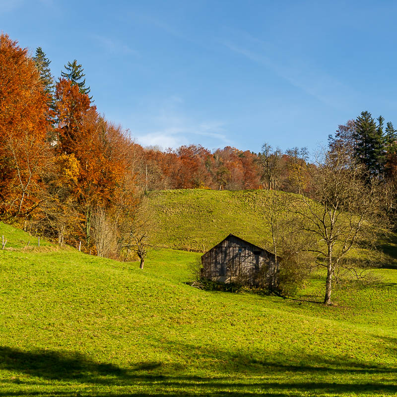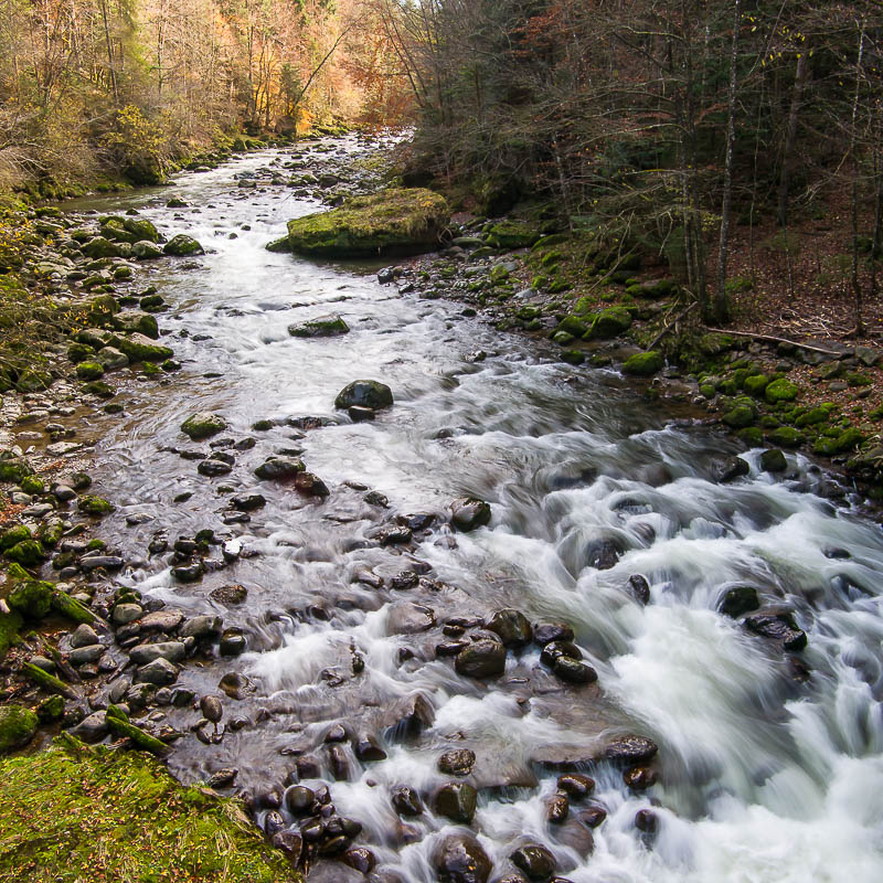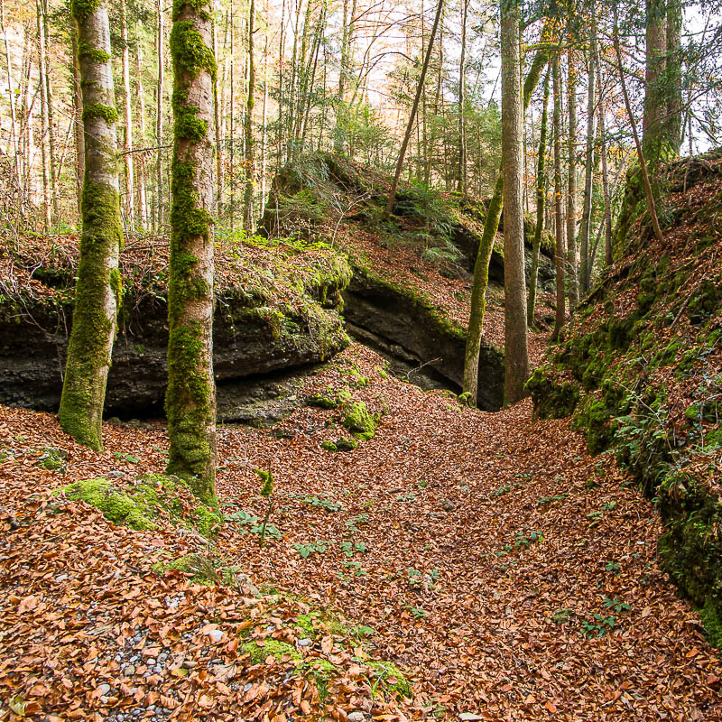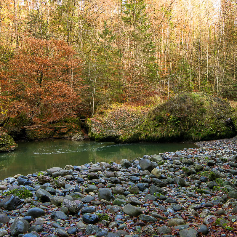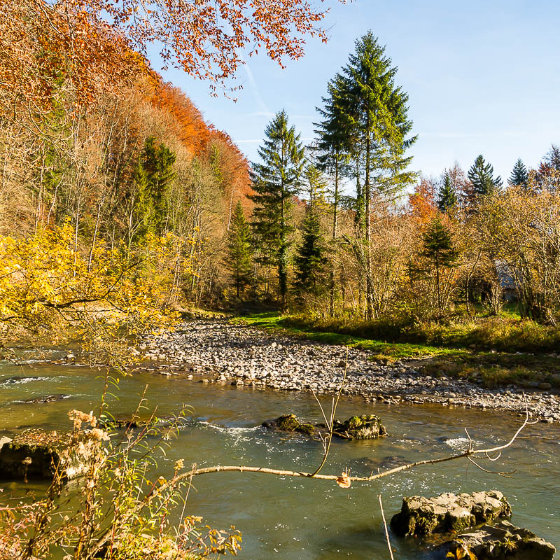 Durch den Wald geht es runter zur Sihl auf einem bequemen Weg durch den späten Herbstwald. Bald ermutigt mich ein kleiner Wasserfall direkt bei der neuen Schifflibrücke, Stativ und Kamera zu montieren und die schöne Herbststimmung mit der Sonne im Gegenlicht einzufangen. Ich probiere verschiedenste Belichtungszeiten und Blendenwerte, um einerseits schön fliessendes Wasser durch lange Belichtungszeiten und andererseits einen perfekten Sonnenstern zu erreichen (28 mm, 0,5 s, f/27). Über den Steg wechsle ich über zur rechten Flussseite und wandere über weiche Wiesenpfade, vorbei an Nagelfluhfelsen (Steinschlaggefahr) weiter zur alten gedeckten Holzbrücke. Immer wieder halte ich an, um die wunderschönen Herbstfarben einzufangen.