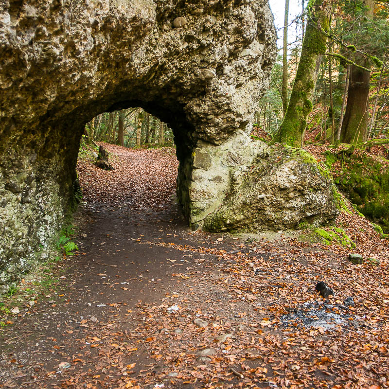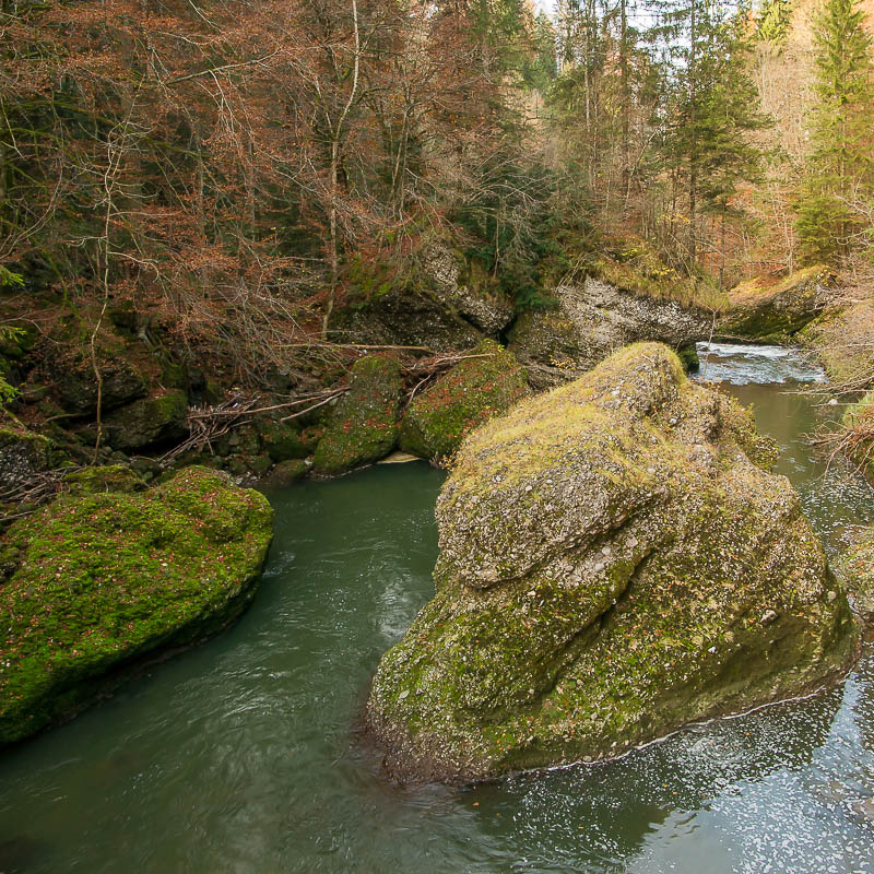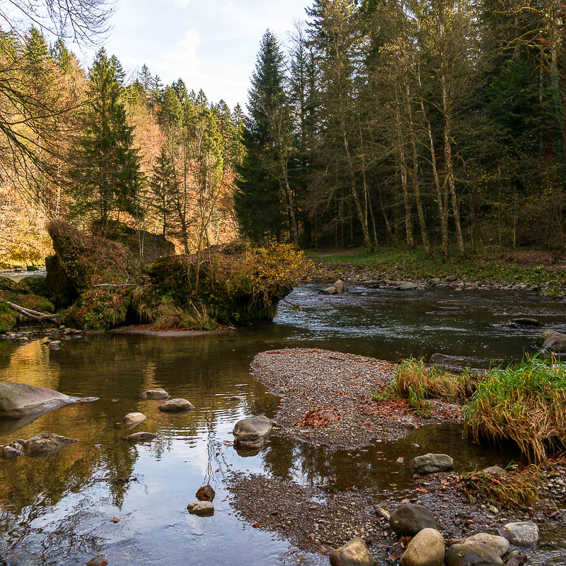 Im leichten Auf und Ab geht’s gemächlich flussaufwärts, einmal hart am Ufer, dann zwischen hohen Nagelfluhfelsen im Uferwald. Besonders schön wird die geschützte Landschaft am Sihlsprung, wo die hohen Nagelfluhfelsen dem Wasser den Weg versperren. Heute allerdings fliesst die Sihl schön zahm, aber ich kann mir vorstellen, dass bei Hochwasser hier einiges los sein kann. Weiter flussabwärts folgen dann Sand- und Steinbänke bis hinunter zur gedeckten Holzbrücke. Über den Steg geht es auf die andere Flussseite und wieder zurück Richtung Sihlbrugg. Der Weg führt teilweise durch Tunnel am steilen Ufer entlang und dann plötzlich wieder über freies Feld. Insgesamt eine kleine, aber schöne Herbstwanderung mit schönen Fotomotiven.