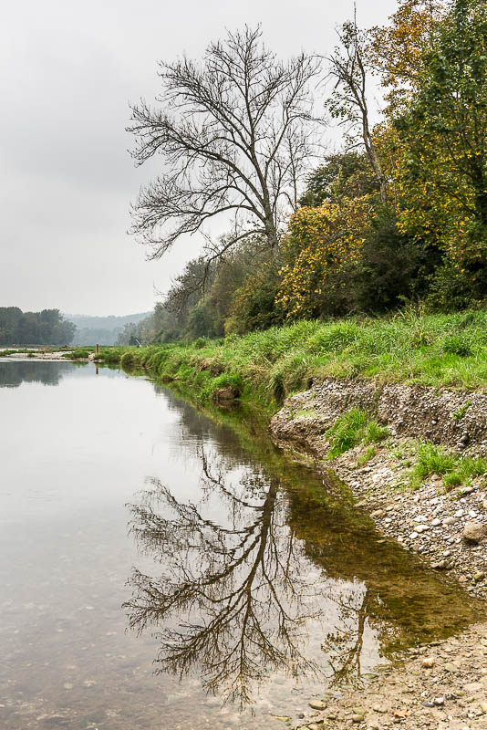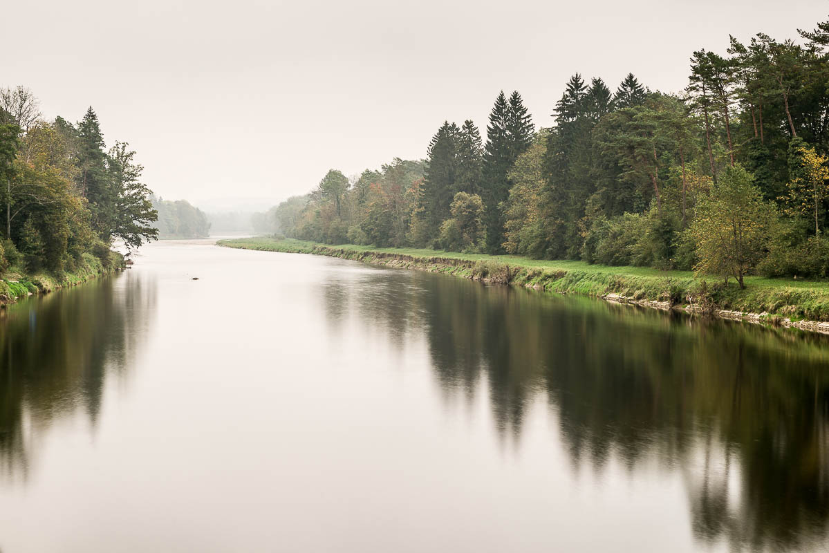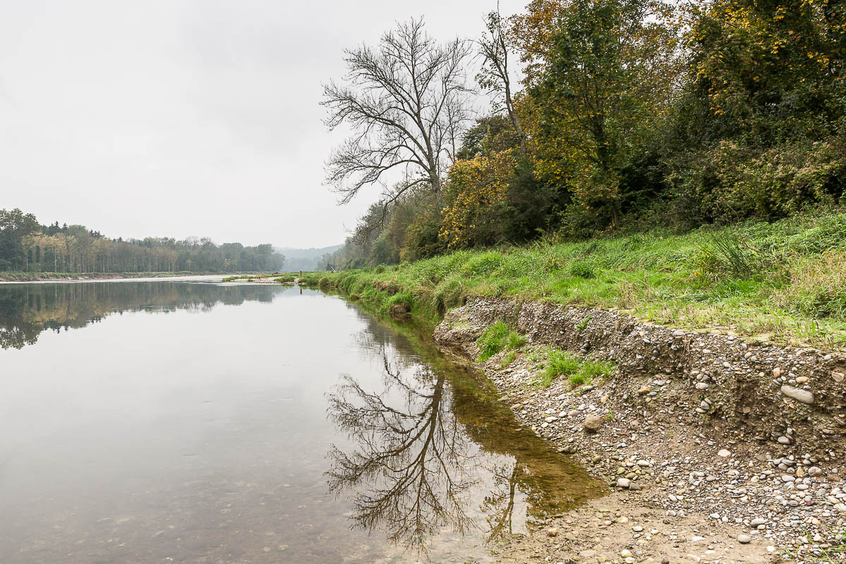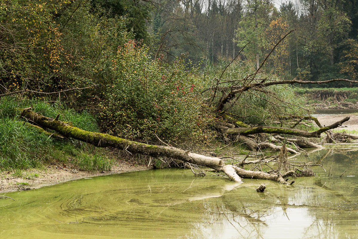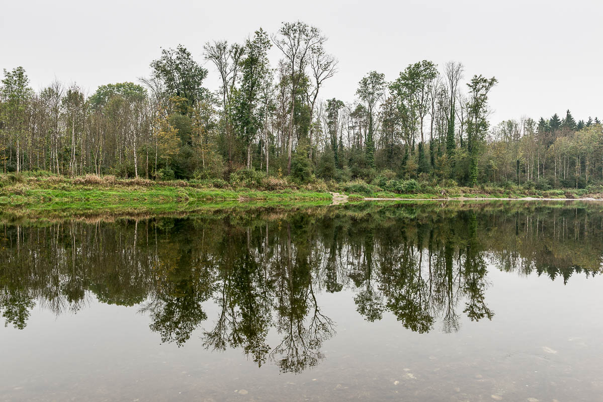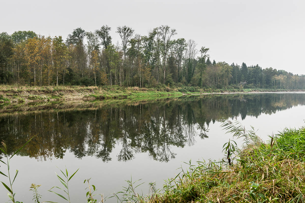 Dort, wo das Wasser der Thur beinahe stillsteht, ergeben sich interessante Spiegelungen mit den über das Wasser ragenden Bäumen. Sorgfältige Wahl des Aufnahmestandortes und eine ausgewogene Bildkomposition sind Pflicht, um maximale Bildwirkung zu erzielen.