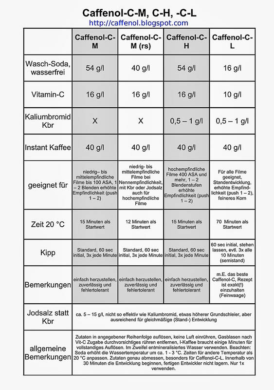 Dann mische man alles zusammen und rühre um, bis sich alles zu einer braunen, stinkenden Brühe aufgelöst hat (sieht aus wie Gülle/Jauche). Das sollte man nicht trinken, aber man kann damit wunderbar Schwarzweiss-Filme entwickeln. Kein Witz. Das Rezept ist bekannt unter dem Namen Caffenol-C-M. Das gibt es aber nicht als fertige Lösung, sondern muss selbst zusammengemixt werden.