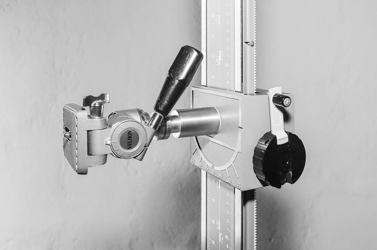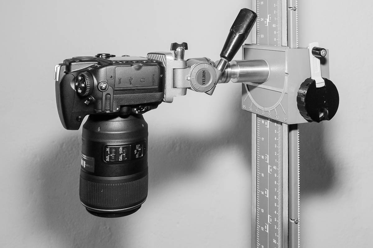 Ich montiere den Kopf des Vergrösserers ab und befestige an dessen Stelle den Stativkopf für die Aufnahme der Kamera. Das Ganze lässt sich in der Höhe präzise einstellen, um den Abbildungsmassstab zu wählen. Mit dem Stativkopf lässt sich die Kamera präzise senkrecht ausrichten (Spiegelmethode).