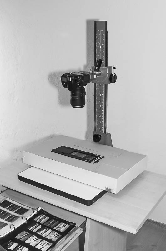 Ich besitze noch von früher meinen Schwarzweiss-Vergrösserungsapparat und ein grosses, gleichmässig leuchtendes Leuchtpult sowie einen alten Stativkopf, welcher zum Fotografieren nicht mehr taugt.