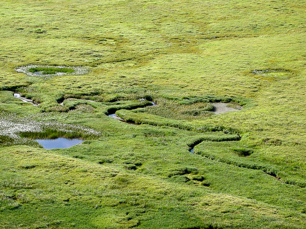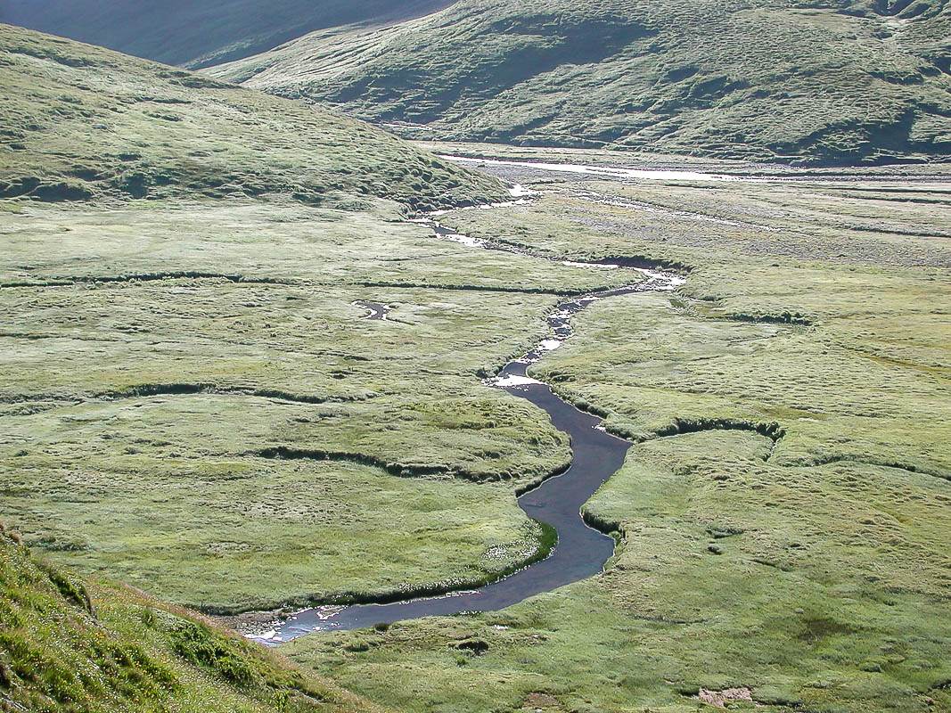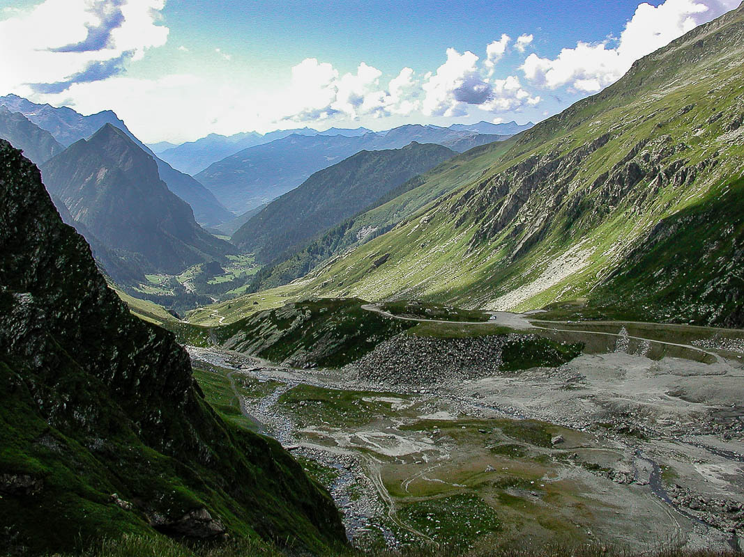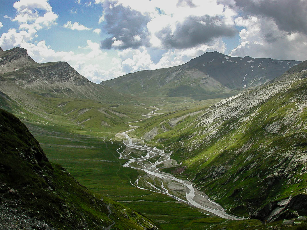 Aber bald wird es flacher und die Passhöhe ist erreicht. Der plötzliche Ausblick auf die Greina-Ebene ist spektakulär. Man bekommt das Gefühl, auf einem fremden Planeten gelandet zu sein. Unvorstellbar, dass hier eine graue Betonmauer (rechts unten im Bild) und ein öder Stausee geplant waren. Ich denke, der Protest der Bevölkerung war mehr als gerechtfertigt.