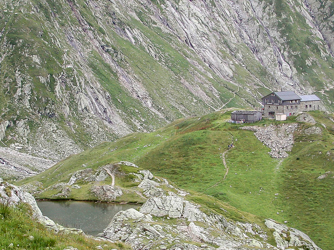 Jetzt folgt ein ruppiger Abstieg von ca. 230 Hm bis auf den Grund der Ebene, dann über eine kleine Brücke und nach einem ebenso ruppigen Gegenanstieg von 50 Hm um den Muot la Greina erblicken wir unser heutiges Tagesziel: die Terrihütte S.A.C. Sie liegt auf einer kleinen Anhöhe in wunderbarer Lage. Wie man sieht, sind wir hier nicht alleine; die Greina-Ebene ist ein beliebtes Wanderziel.