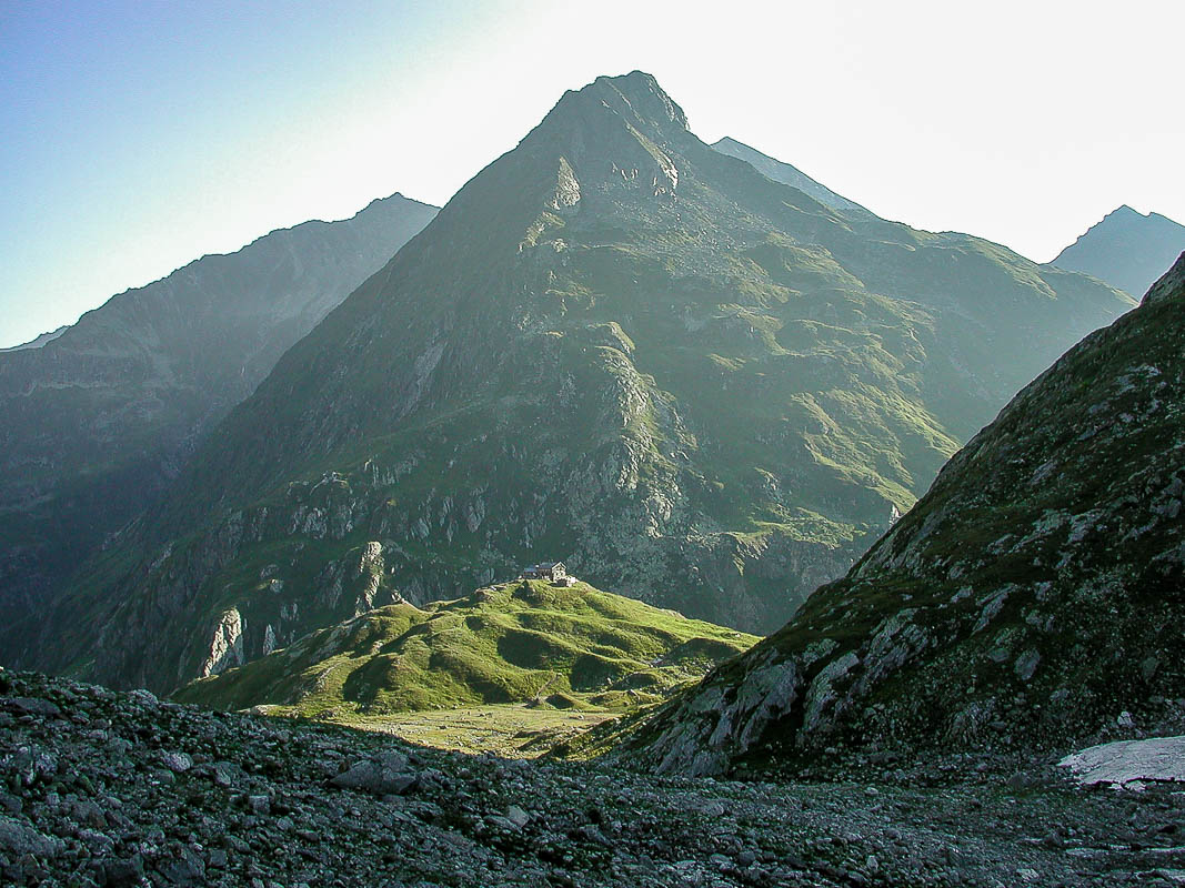 Kurz nach dem Verlassen der Terrihütte, welche sich zum Abschied nochmals im besten Licht präsentiert (mit dem Piz las Palas im Hintergrund), erhaschen wir den ersten Einblick in die Greina-Ebene mit dem Piz Ner und dem Pizzo di Güida im Hintergrund.