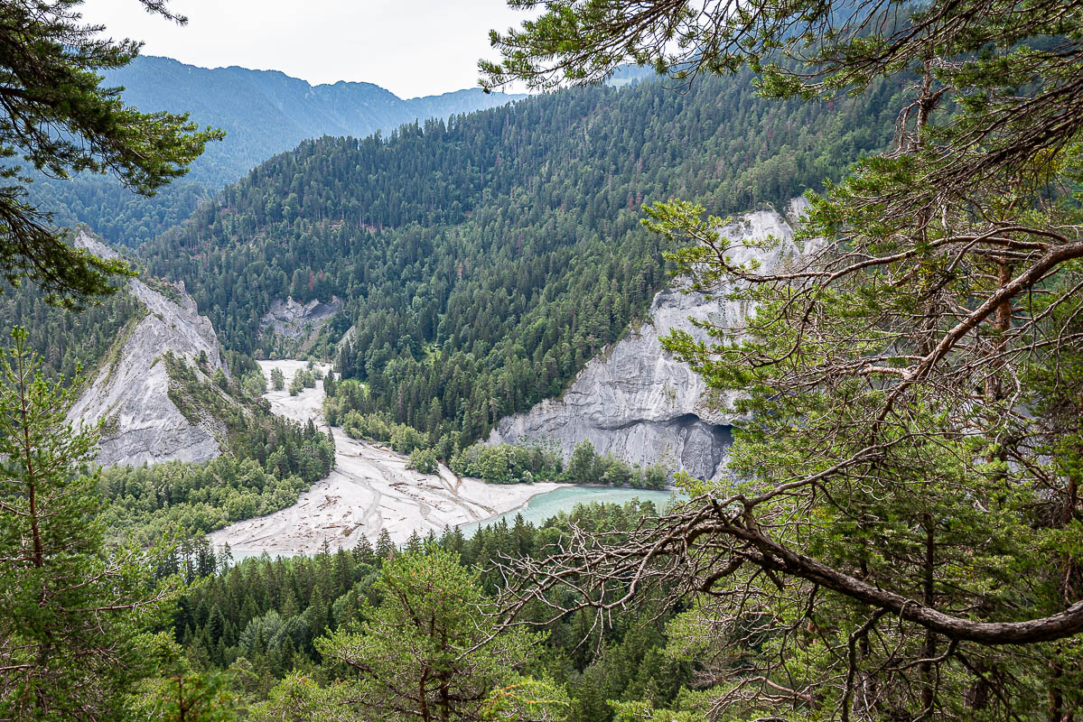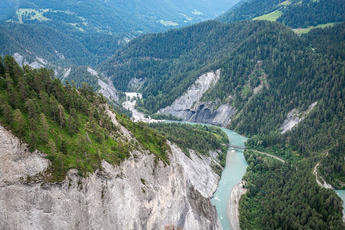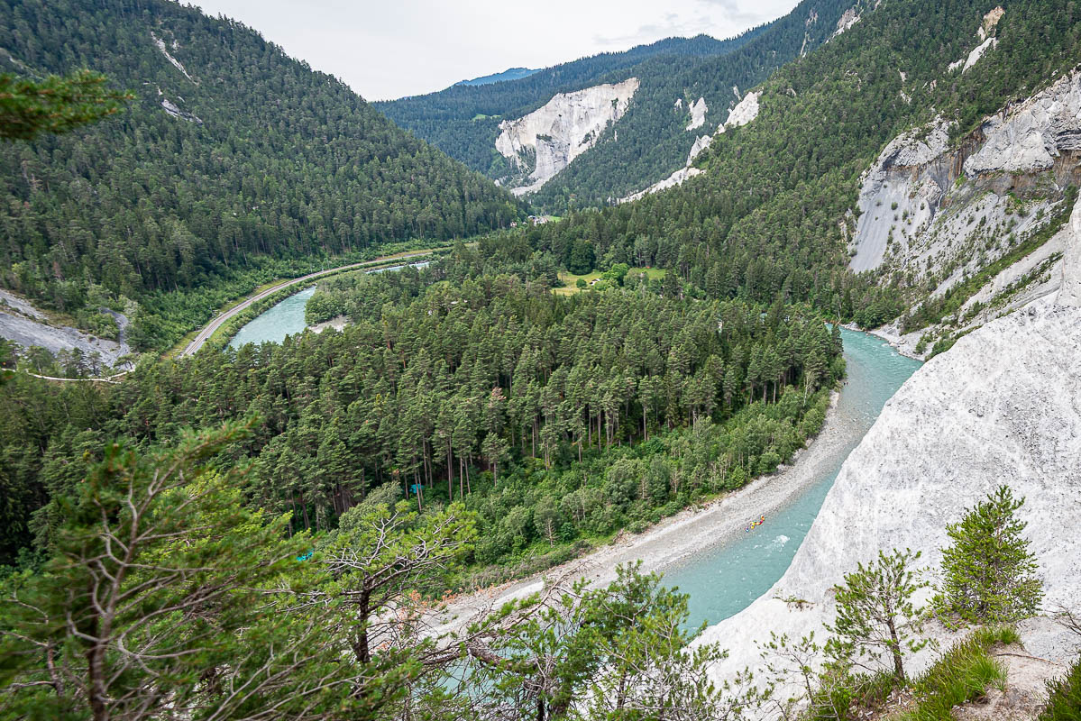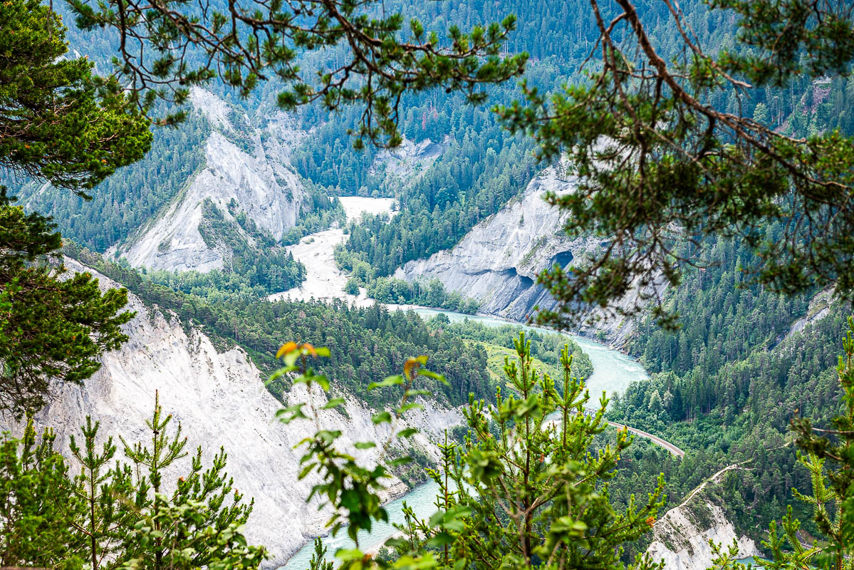 Schnell erreiche ich den Weiler Conn mit dem bekannten Restaurant und einige Minuten später die Aussichtsplattform «Il Spir». Dazwischen erhasche ich erste Blicke auf mein Tagesziel: die Rheinschlucht.