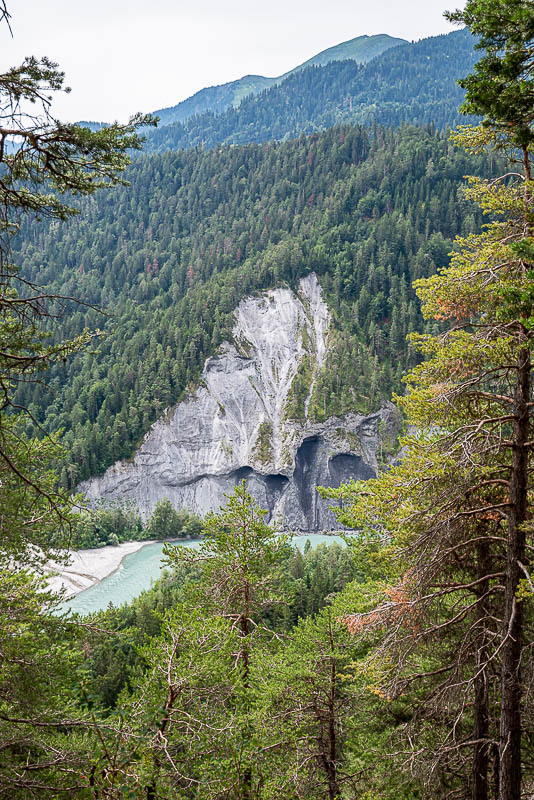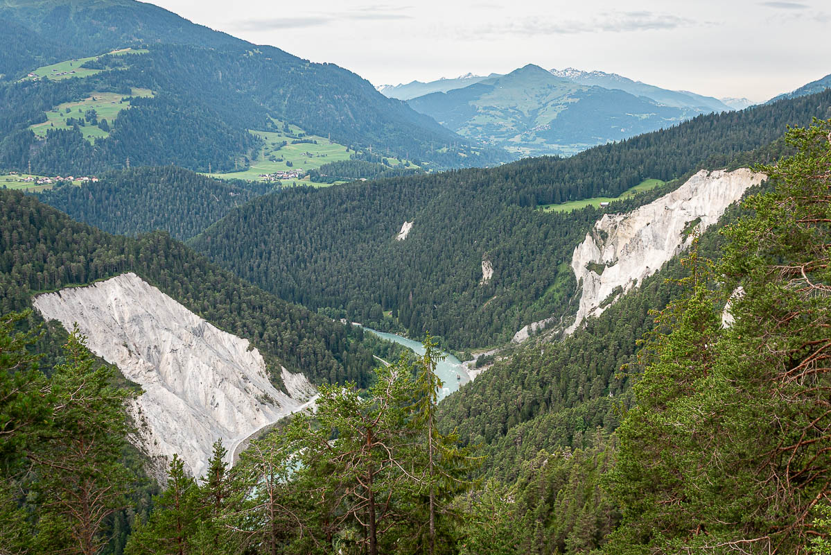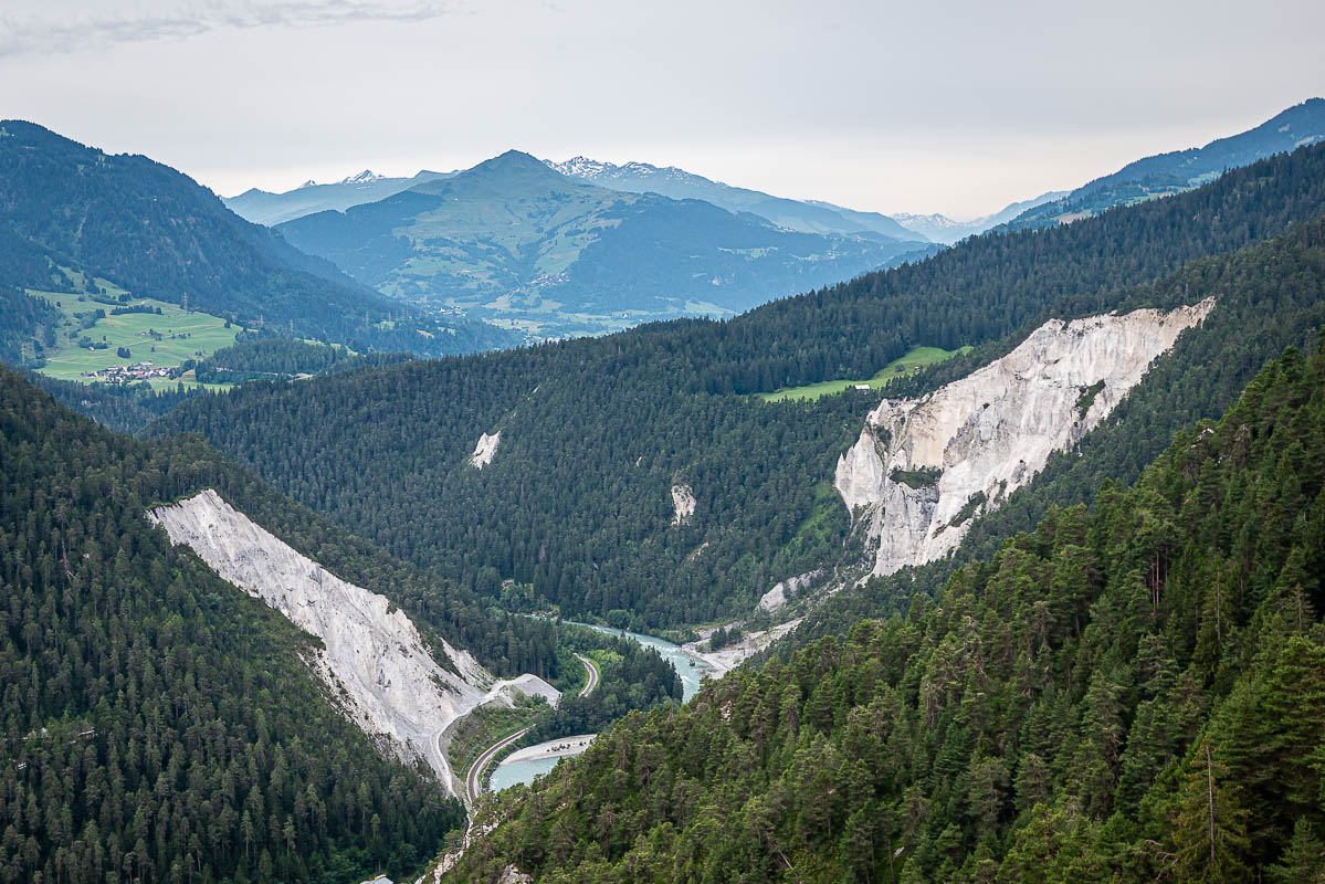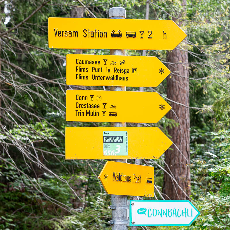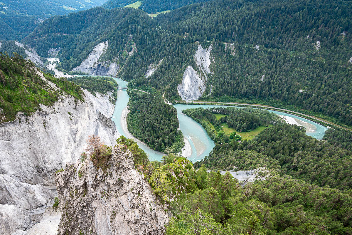 Schnell erreiche ich den Weiler Conn mit dem bekannten Restaurant und einige Minuten später die Aussichtsplattform «Il Spir». Dazwischen erhasche ich erste Blicke auf mein Tagesziel: die Rheinschlucht.