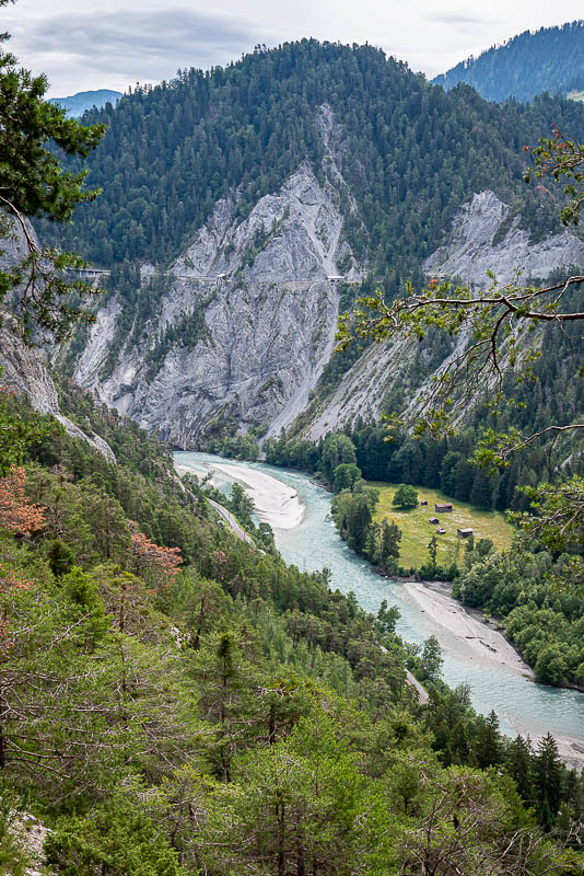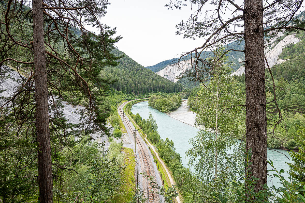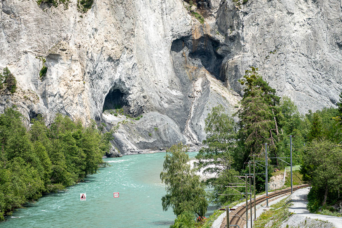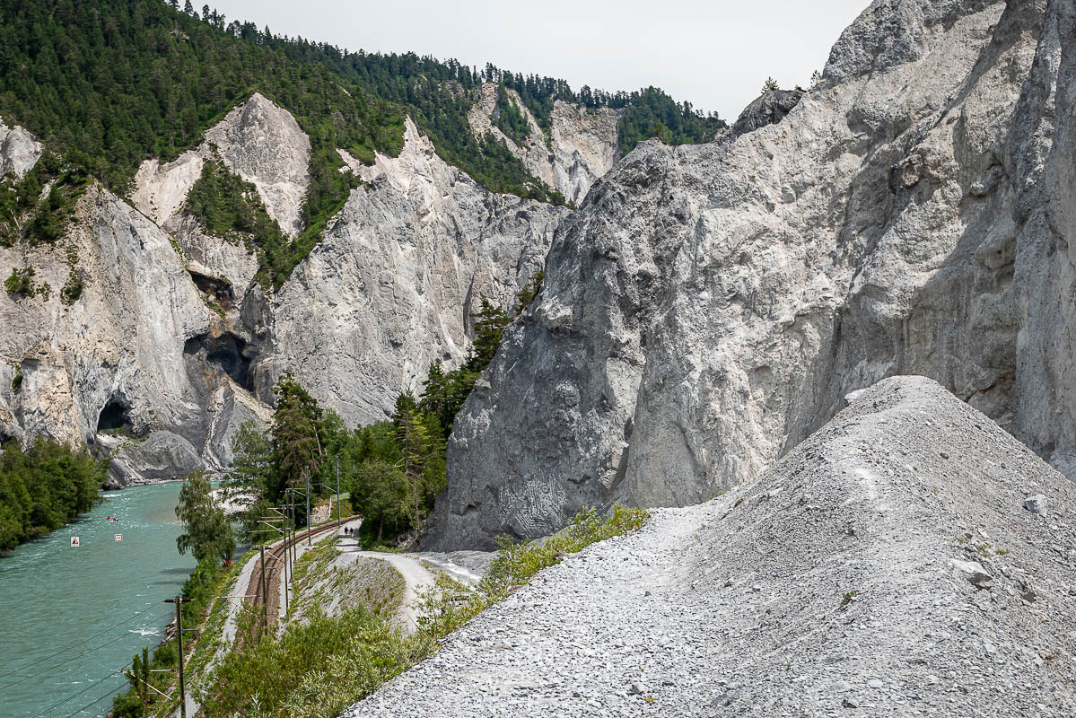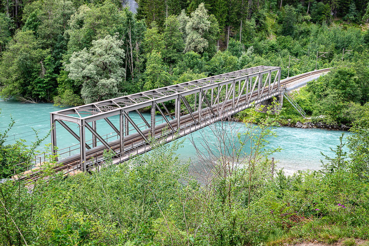 Endlich erreiche ich den Talgrund bei der Eisenbahnbrücke der RhB über den Rhein. Die Bahn schlängelt sich genau wie der Rhein durch die gesamte Rheinschlucht. An ganz engen Stellen führt die Bahnstrecke durch Tunnel. Im Gegensatz zur Bahn ist die Rheinschlucht ab hier Richtung Reichenau bis fast zum Bahnhof Trin zu Fuss nicht mehr begehbar. Es gibt Ideen, dieses Teilstück für Wanderer ebenfalls noch zu erschliessen.