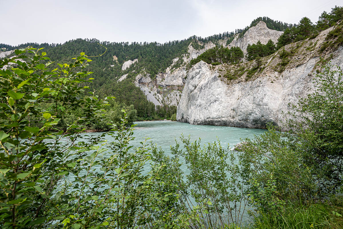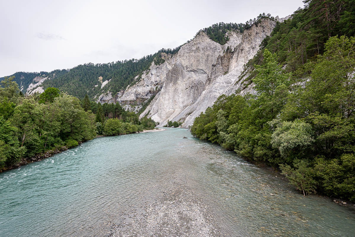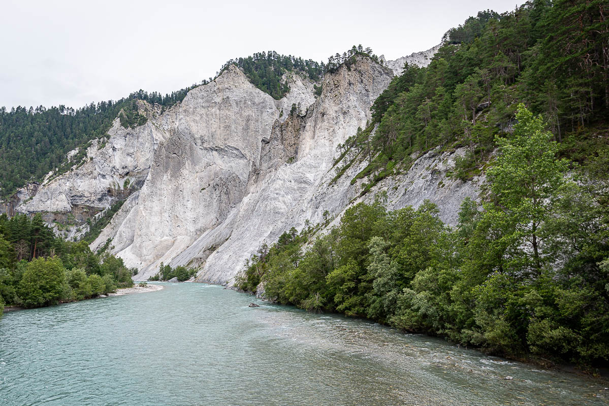 Entspannt – und froh, dass ich den mühsamen Abstieg von Conn hinter mir habe – marschiere ich Richtung der RhB-Station Versam-Safien. Dazwischen gibt es doch noch einige Bilder der spektakulären Szenerie. Mich erstaunt das klare türkisfarbene Wasser nach der relativ langen Regenperiode. Ich hätte das eher schmutzig-braun erwartet.