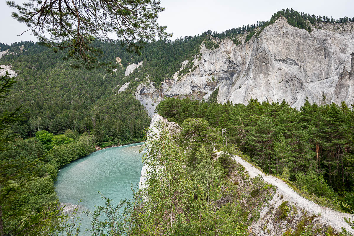 Und immer wieder ergeben sich während des Abstiegs interessante Tiefblicke, zum Beispiel auf die Mündung der Rabiusa in den Vorderrhein oder auf die Strasse der Felswand entlang hinauf nach Versam oder auch auf die paar Gebäude der Isla Davos im Talgrund.