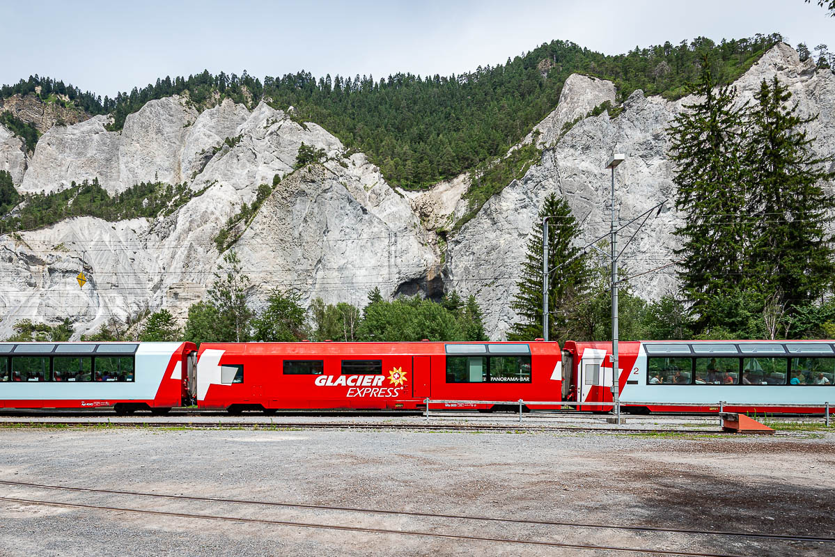 Bei der Station Versam-Safien wartet der berühmte Glacier-Express – der langsamste Schnellzug , wie die Touristiker meinen – auf die Weiterfahrt. Die Bahn fährt eingleisig, sodass nur an bestimmten Stellen gekreuzt werden kann. Ich aber gehe an der Station vorbei, denn ich möchte noch einen weiteren interessanten Abschnitt kennenlernen, bevor ich zur Station zurückkehre.