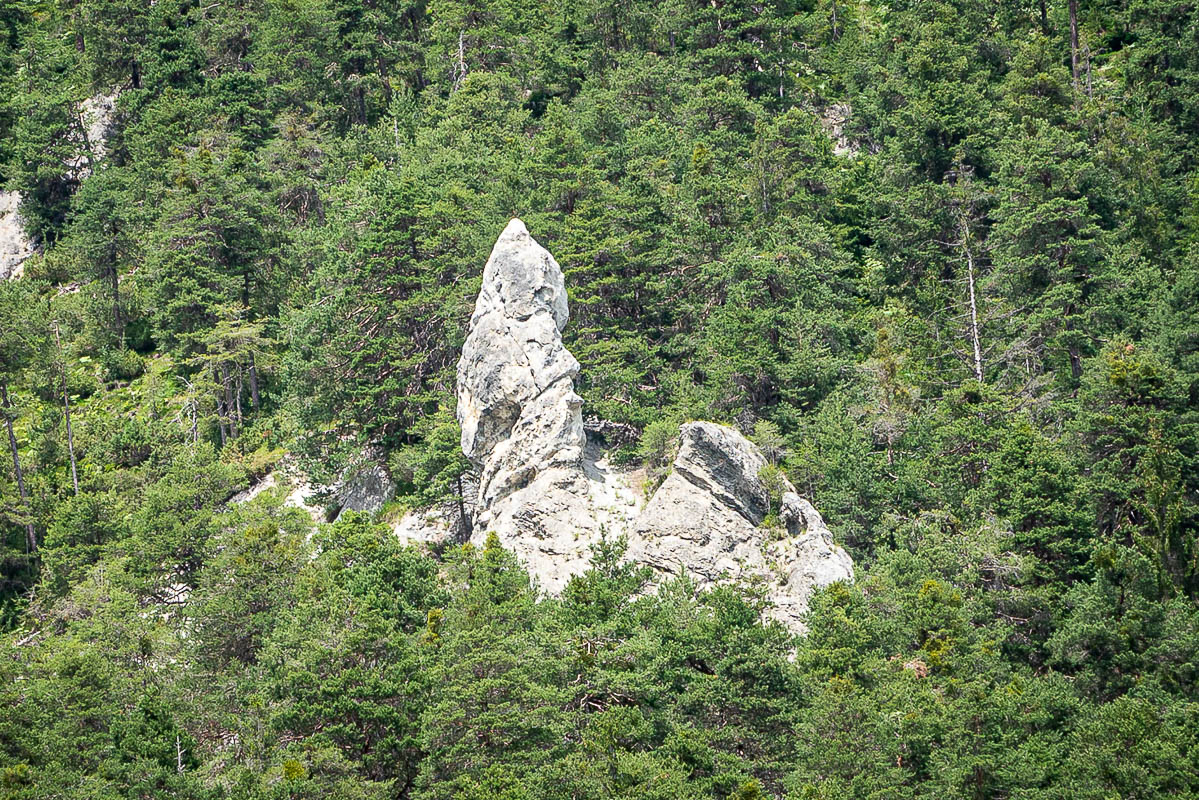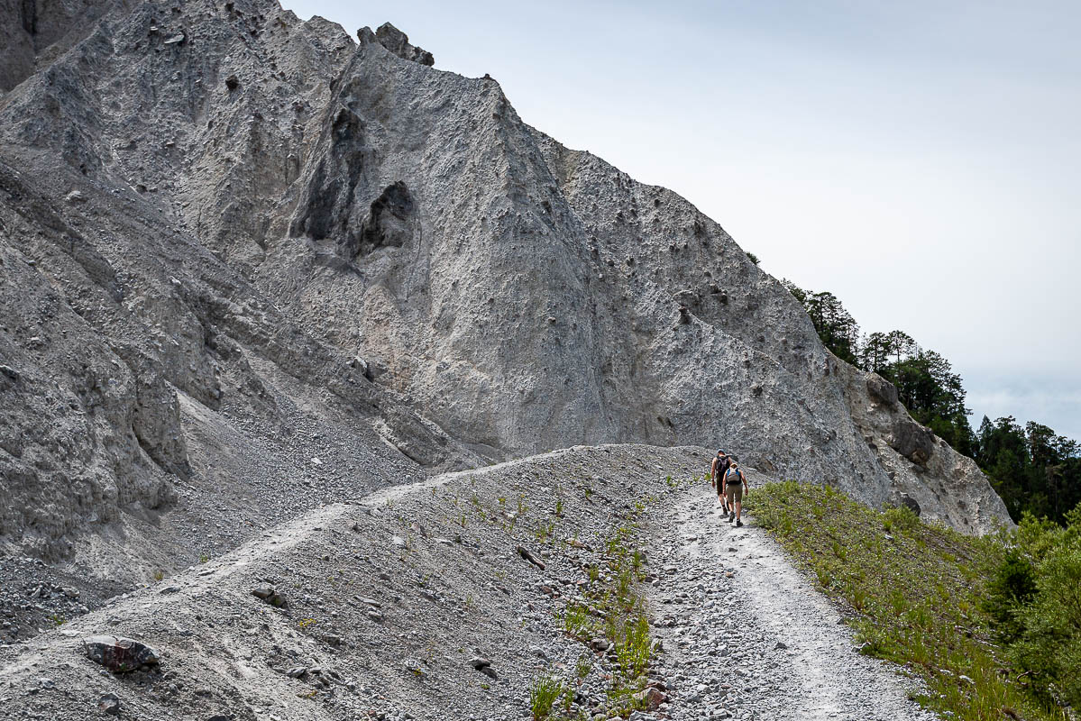 Hier führt die Bahnstrecke ganz eng an einer senkrechten Abbruchstelle vorbei. Um Schäden durch Steinschlag zu vermeiden, wurde ein Damm aufgeschüttet, über den nun auch der Wanderweg führt. So sind Bahn und Wanderer relativ gut geschützt.