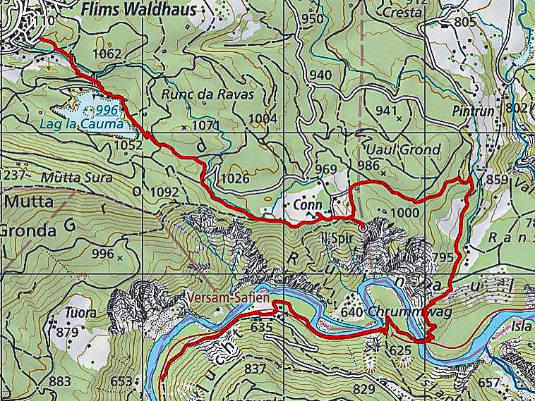 Jetzt braucht es nochmals einen kleinen Effort, um über die Chli-Isla-Halbinsel zu kraxeln. Ganz oben gibt’s ein Plätzchen für die Mittagspause mit schönem Blick talaufwärts. Anschliessend steige ich hinunter und wandere ohne weitere Anstrengungen Richtung Bahnhof Versam-Safien, brav entlang der Bahnlinie.